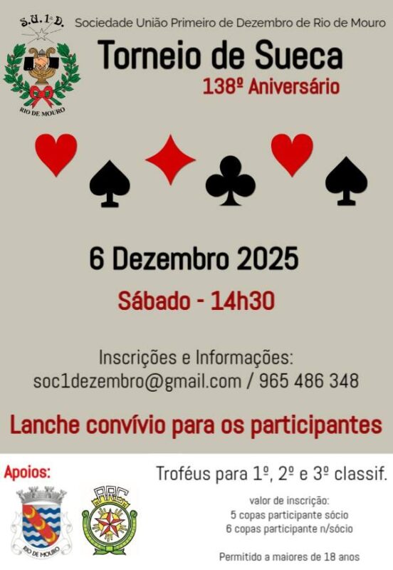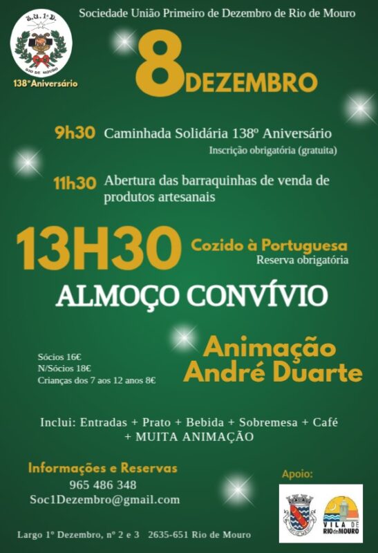 View Larger Image 138º Aniversário da Sociedade União 1º de Dezembro A Sociedade União 1º de Dezembro de Rio de Mouro celebra o seu 138º Aniversário. A associação mais antiga Freguesia tem as suas habituais comemorações que já se iniciaram no mês de Novembro prolongam-se pelo mês de Dezembro. Participe! Mónica Gonçalves2025-11-13T15:32:26+00:00Novembro 13, 2025|Associações, Associativismo, Cultura e Recreio, Em destaque, Recreio| Partilhe esta página: FacebookTwitterRedditLinkedInWhatsAppTelegramTumblrPinterestEmail (necessário mas não publicado) Artigos relacionados Recolha de Monos no mês de Outubro Gallery Recolha de Monos no mês de Outubro Sintra apresenta exposição de Caricaturas de Mário Soares em Algueirão – Mem Martins e Rio de Mouro Gallery Sintra apresenta exposição de Caricaturas de Mário Soares em Algueirão – Mem Martins e Rio de Mouro Campanha de angariação de alimentos na Refood de Rio de Mouro Gallery Campanha de angariação de alimentos na Refood de Rio de Mouro Pharmalírios organiza Mercado de Natal Gallery Pharmalírios organiza Mercado de Natal
