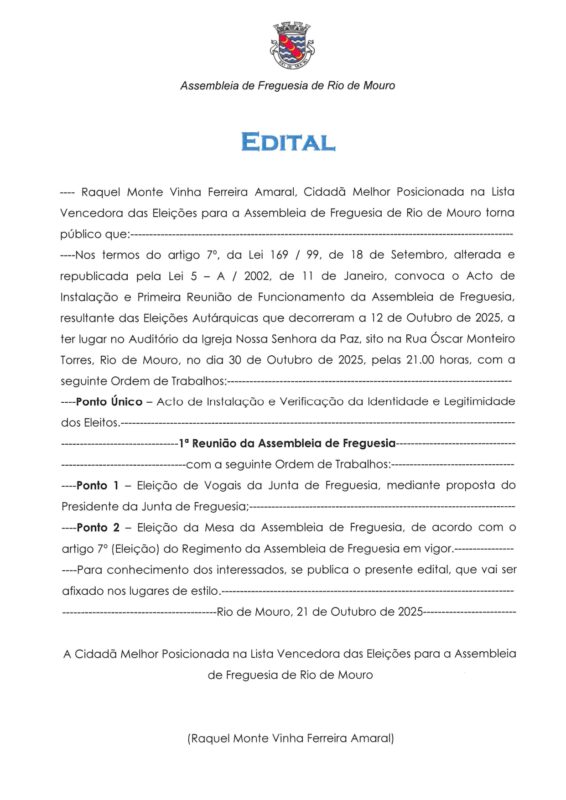 View Larger Image Acto de Instalação e Primeira Reunião de Funcionamento da Assembleia de Freguesia Mónica Gonçalves2025-10-31T17:05:07+00:00Outubro 22, 2025|Assembleia de Freguesia| Partilhe esta página: FacebookTwitterRedditLinkedInWhatsAppTelegramTumblrPinterestEmail (necessário mas não publicado) Artigos relacionados Assembleia de Freguesia reúne a 28 de janeiro Gallery Assembleia de Freguesia reúne a 28 de janeiro Assembleia de Freguesia reúne a 17/12/2025 Gallery Assembleia de Freguesia reúne a 17/12/2025 Assembleia de Freguesia reúne a 25/09/2025 Gallery Assembleia de Freguesia reúne a 25/09/2025 Assembleia de Freguesia reúne a 25/06/2025 Gallery Assembleia de Freguesia reúne a 25/06/2025