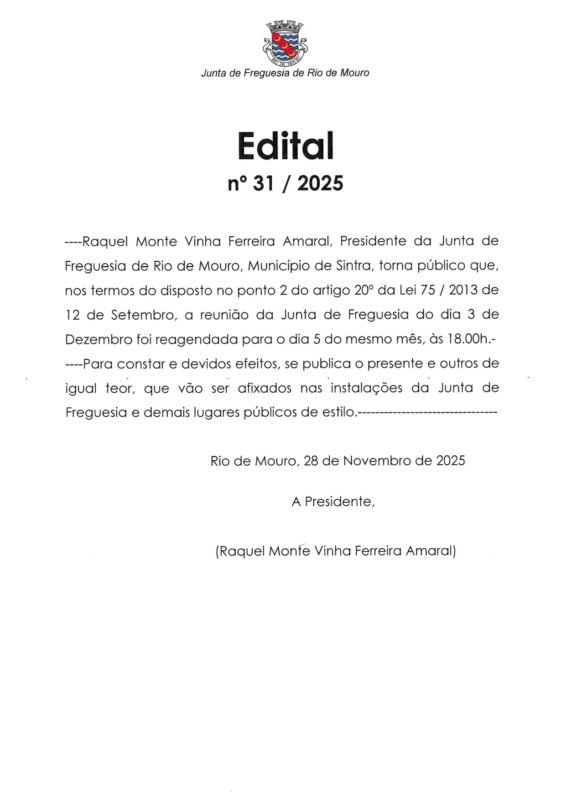 View Larger Image Alteração de Data de Reunião de Junta A Reunião de Junta marcada para o dia 03/12/2025 foi reagendada para o dia 05/12/2025 às 18h00 nas instalações da Junta de Freguesia. Mónica Gonçalves2025-12-02T11:46:10+00:00Dezembro 2, 2025|Em destaque, Reunião de Junta, Serviços| Partilhe esta página: FacebookTwitterRedditLinkedInWhatsAppTelegramTumblrPinterestEmail (necessário mas não publicado) Artigos relacionados Recolha de Monos no mês de Novembro Gallery Recolha de Monos no mês de Novembro Casa do Pai Natal no Fitares Shopping da Rinchoa Gallery Casa do Pai Natal no Fitares Shopping da Rinchoa 12º Passeio Solidário Pais Natal Gallery 12º Passeio Solidário Pais Natal Câmara de Sintra abre candidaturas à Horta Solidária da Nova Imagem Gallery Câmara de Sintra abre candidaturas à Horta Solidária da Nova Imagem