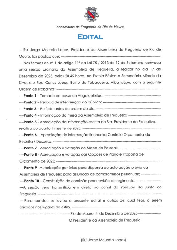 No próximo dia 17/12 pelas 20h45 decorre mais uma sessão da Assembleia de Freguesia de Rio de Mouro.