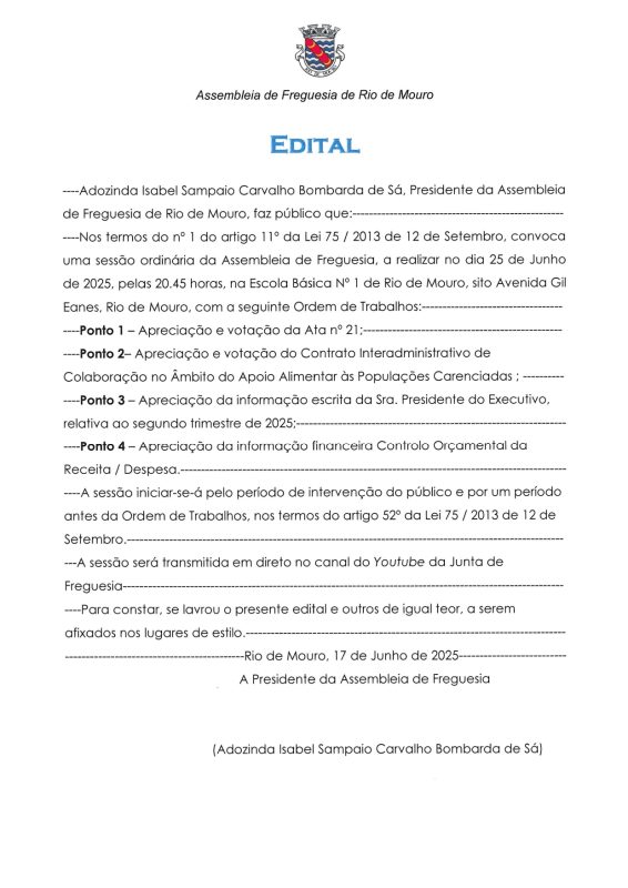 No próximo dia 25/06 pelas 20h45 decorre mais uma sessão da Assembleia de Freguesia de Rio de Mouro.