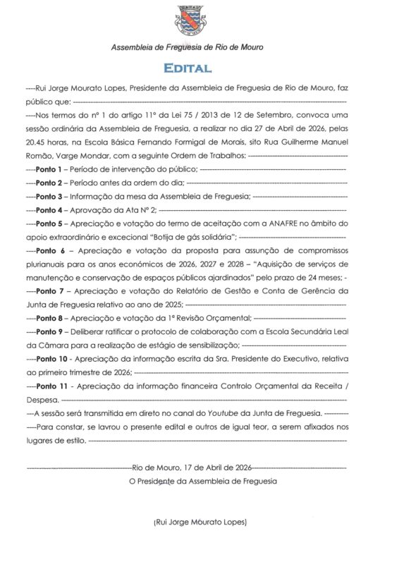No próximo dia 27 de abril, pelas 20h45, decorre uma sessão ordinária da Assembleia de Freguesia de Rio de Mouro.
