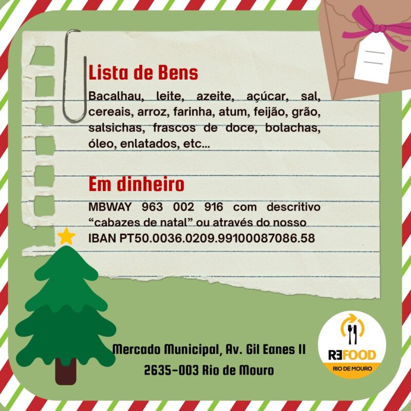 Os alimentos solicitados para constituir os cabazes de natal são: Bacalhau, leite, azeite, açúcar, sal, cereais, arroz, farinha, atum, feijão, grão, salsichas, frascos de doce, bolachas, óleo, enlatados, e podem ser entregues até ao dia 10 de dezembro nas instalações da Refood de Rio de Mouro.