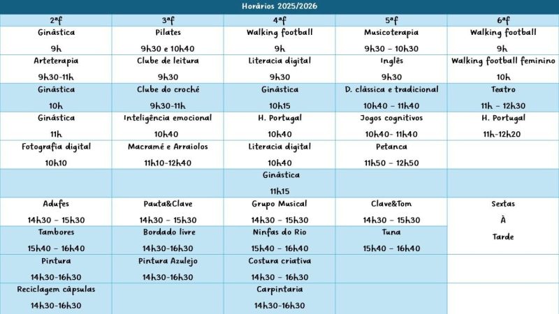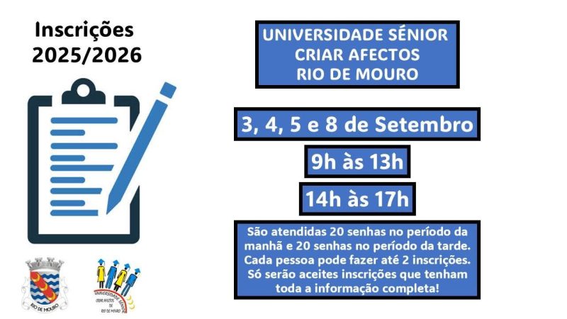 Nos dias 03, 04, 05 e 08 de Setembro decorrem as inscrições da Universidade Sénior Criar Afectos de Rio de Mouro para o ano lectivo 2025/2026.