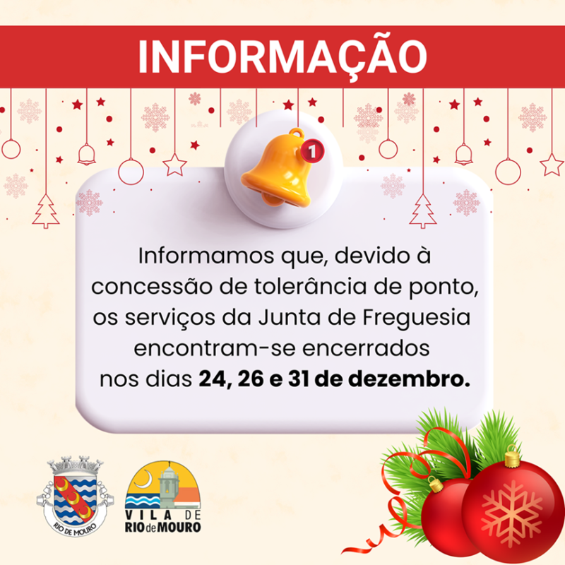 View Larger Image Tolerância de Ponto nos dias 24, 26 e 31 de Dezembro A Junta de Freguesia de Rio de Mouro informa que foi concedida tolerância de ponto nos dias 24, 26 e 31 de Dezembro. Mónica Gonçalves2026-01-02T09:32:19+00:00Dezembro 22, 2025|Serviços, Serviços Administrativos| Partilhe esta página: FacebookTwitterRedditLinkedInWhatsAppTelegramTumblrPinterestEmail (necessário mas não publicado) Artigos relacionados Mapa de subvenções públicas 2025 Gallery Mapa de subvenções públicas 2025 Tolerância de ponto no dia 17 de Fevereiro Gallery Tolerância de ponto no dia 17 de Fevereiro Serviços Administrativos encerrados no dia 09 de Fevereiro Gallery Serviços Administrativos encerrados no dia 09 de Fevereiro Serviços Administrativos encerrados no dia 19 de Janeiro Gallery Serviços Administrativos encerrados no dia 19 de Janeiro